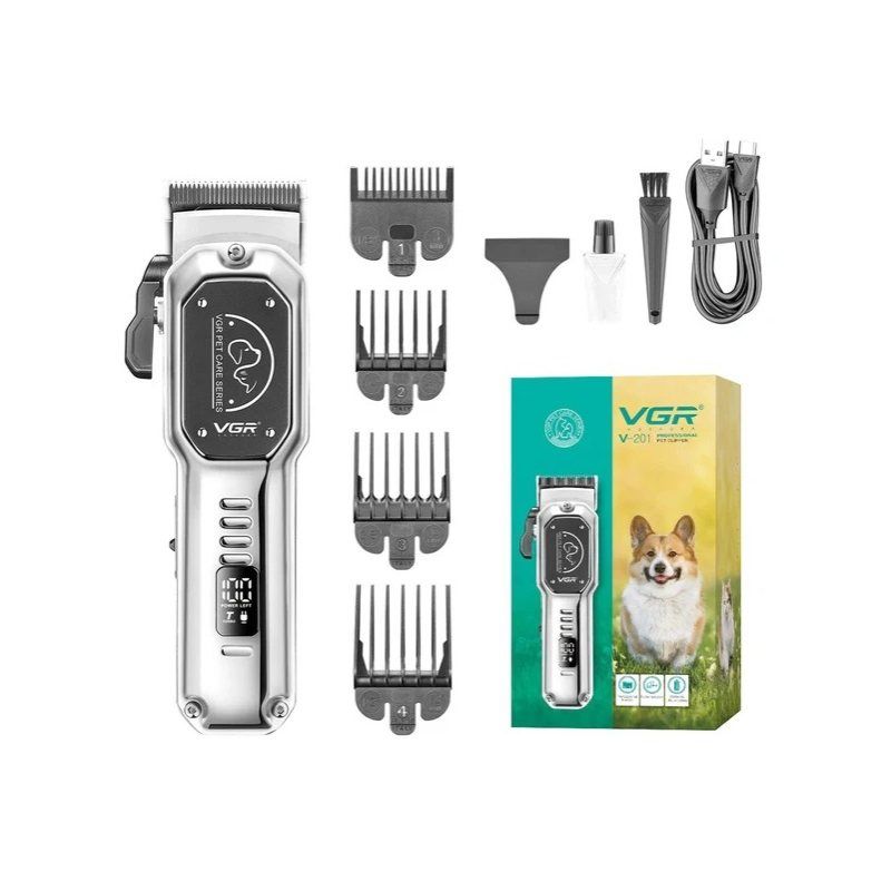 ماشین اصلاح حرفه‌ای VGR V-201 مخصوص حیوانات خانگی؛ موتور قدرتمند، صدای کم، تیغه استیل ضدزنگ و باتری شارژی برای اصلاح سریع و دقیق.