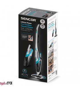 جارو شارژی سنکور مدل SVC 0740BL باتری 2200 میلی‌آمپری ولتاژ 40/7 ولت صدای 75 دسی‌بل در حالت حداکثری 85 دقیقه زمان مفید استفاده دارای زمان شارژ 5 ساعت ظرفیت مخزن 0/5 لیتری وزن 3 کیلوگرم ساخت جمهوری چک مونتاژ چین